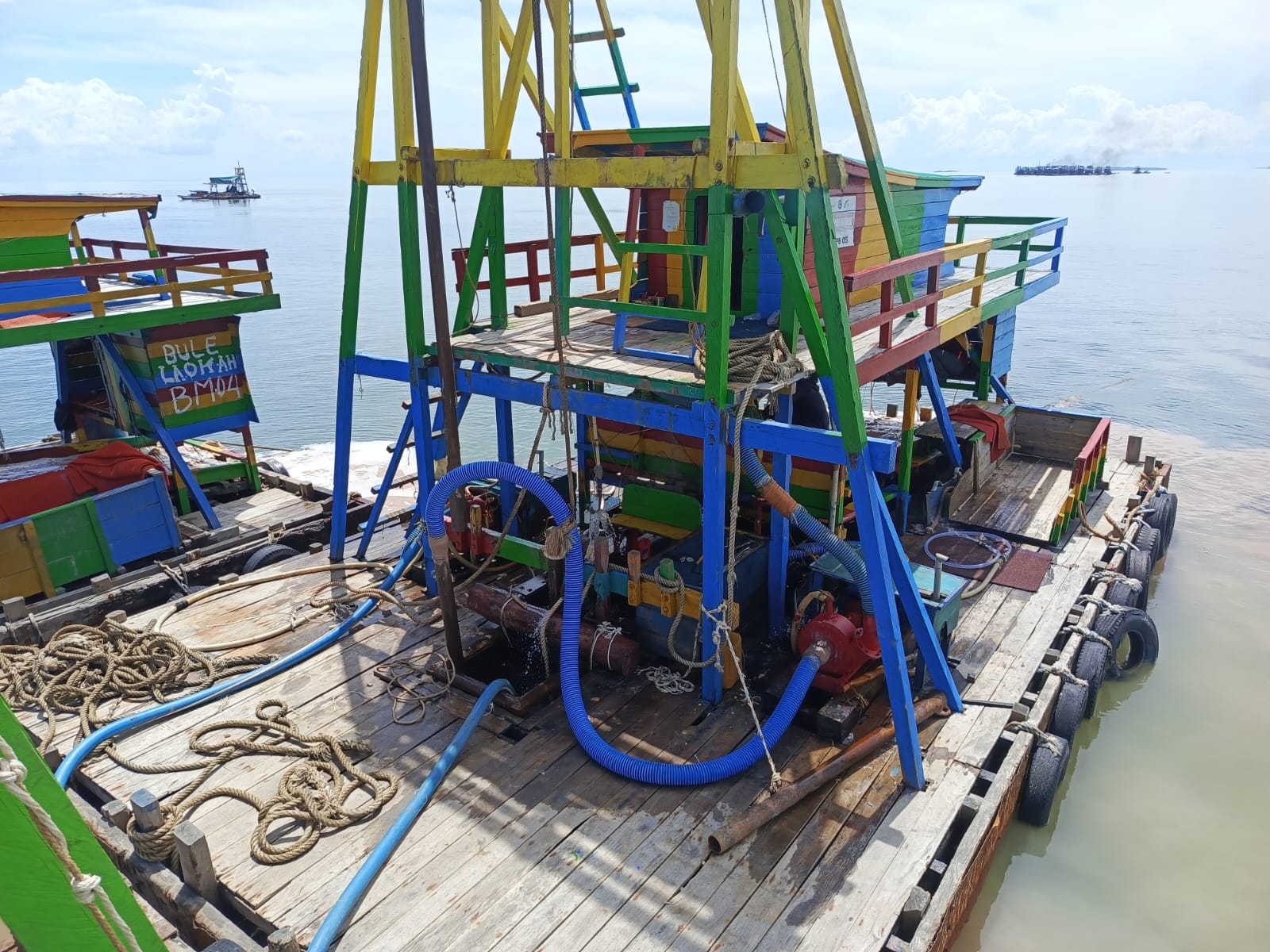 ” Kami menemukan ponton yang tak memiliki SILO, Bertuliskan Pelangi Berkah berwarna Biru, Merah diselingi kuning yang ikut menambang di laut Tempilang, tanpa Pagar dan tanpa adanya alat pengaman seperti yang Seharusnya”, ungkap Iwan salah satu awak media yang turun ke lokasi.